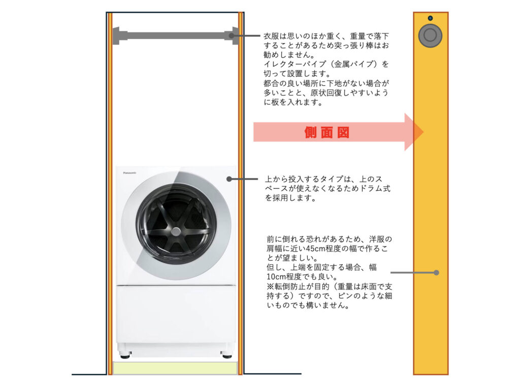 洗濯機は普通の洗濯機では洗濯機置き場の上のスペースを洋服掛けとして使うことができません。