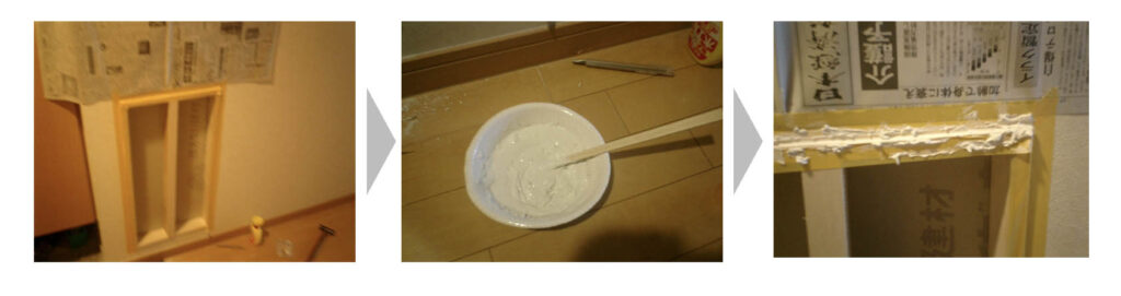 木枠と壁の開口部にできた隙間を埋めるため、壁と枠を養生して隙間に壁パテを埋め込みます。