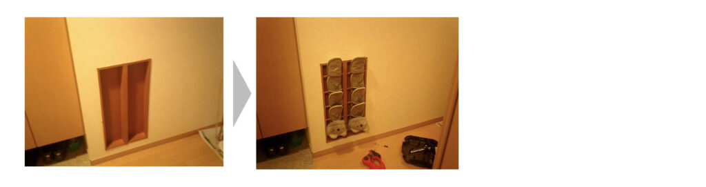 そのような理由で、壁の中の空間を活かしたスリッパラックを仕立てました。