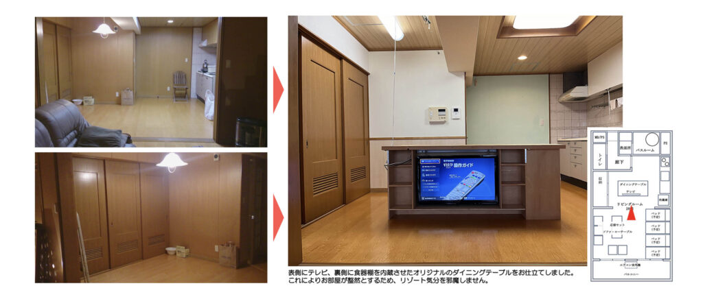 お部屋の雰囲気を壊さないよう、テレビは壁側に設置するのではなく、アイランド式(ダイニングテーブル)に取り付けました。