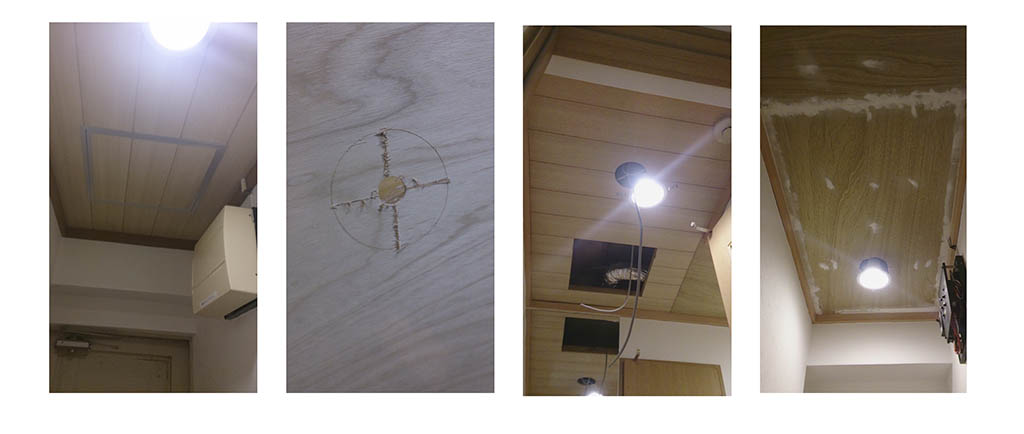 玄関が薄暗いので、板張りの天井の上にベニヤ板の下地を作り、ダウンライトの数を増やして改善します。