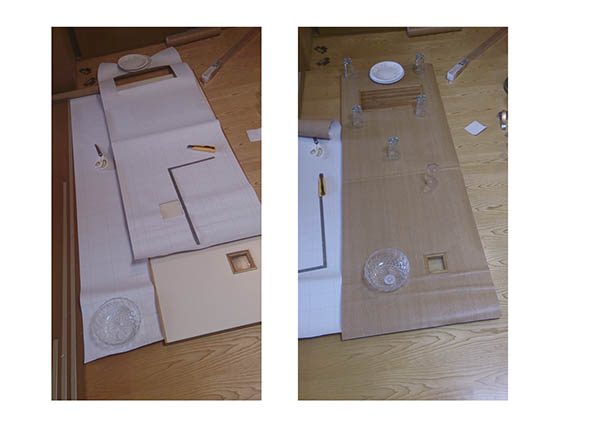 配線を整理して、1つの穴に集約させるように引き回します。不要になった穴は木の板で塞ぎ、パテで埋めてサンダーを掛けて平らにします。