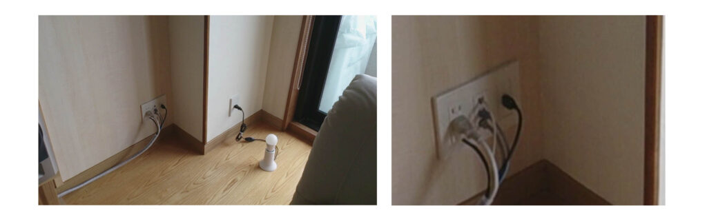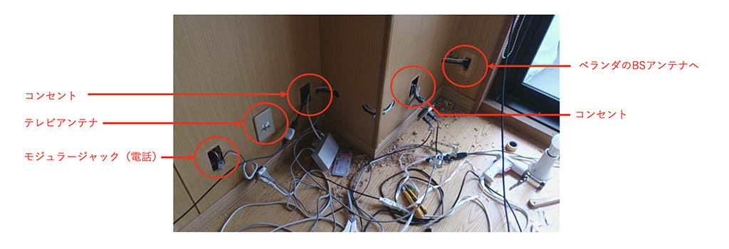 リビングの隅のスペースに、テレビアンテナの端子や電話、コンセントなどが集まっていますが、各々が独立していてややうるさい印象を感じます。