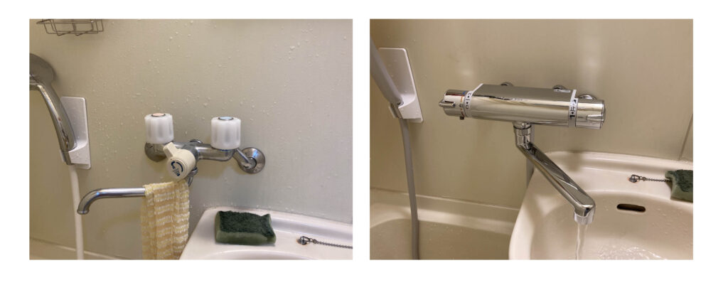 ついでに、温度調整がしにくいツーハンドル式の水栓も、温度調整がしやすい水栓に交換します。