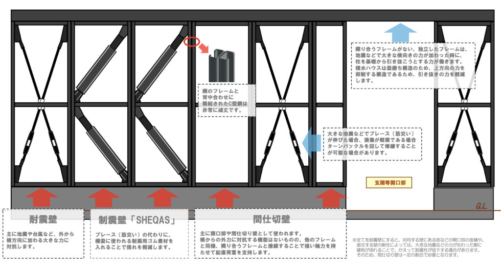 さらには隣り合うフレームに対してはC型鋼どうしが背中合わせに緊結されることで強力な軸力が得られるとともに、強い外力が加わった際に菱形に曲げようとする力を面で受け止めることで無理なく基礎や梁などに分散して逃します。