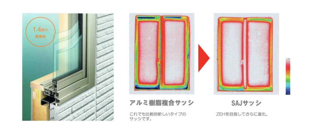 積水ハウスのSAJサッシ(超高断熱アルミ複合サッシ)は、外部には厳しい日差しに耐える耐候性の高いアルミを、室内には質感や断熱性の高い樹脂を使用した複合構造サッシです。SAJサッシの複層ガラスはアルゴンガス入りで、最も効果的な中空層16mmを確保しています。