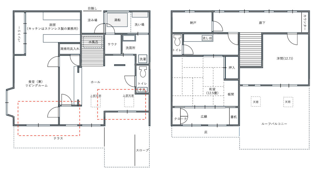 湯船は現実的な範囲(家庭用の熱源機で使うことや、ランニングコストも考えなければなりません。)で可能な限りで広く確保した1.2m x 1.8mサイズを採用。