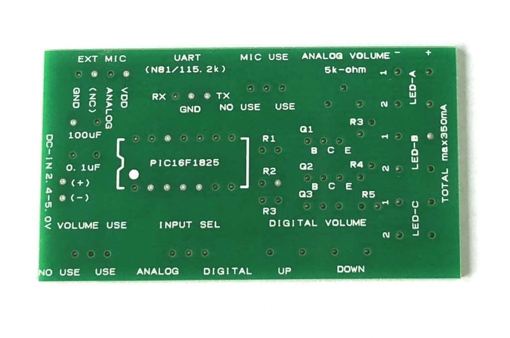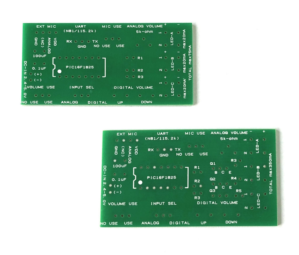 ICにLEDを直結させた時の出力上限は15ミリアンペアとなりますが、さらに強く光らせたい場合に必要となるトランジスタ実装スペースを追加したボードとなります。