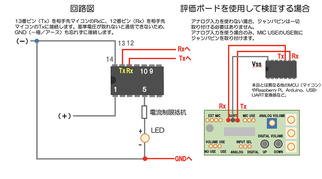| 13 | RX端子から受信した輝度調整用電文を2台目以降の本品にリレーします。 ※GNDの接続も忘れずに行ってください。 ※相手先マイコンの電圧が本品と異なる場合、そのまま接続すると故障の原因となります。 レベルコンバータ等を入れてください。 |