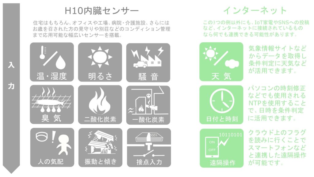 H10に搭載された基本9センサーをオリジナルのプログラムで必要な機能が実現できそうなクラウドサービスと連携させます。