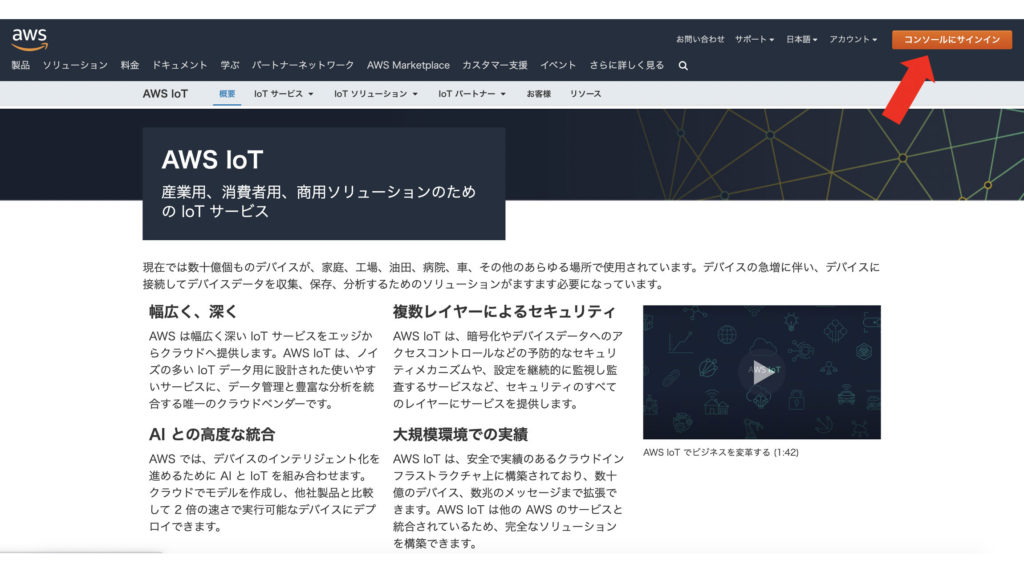 (2)AWSトップページが表示されたら、【コンソールにサインイン】をクリックします。