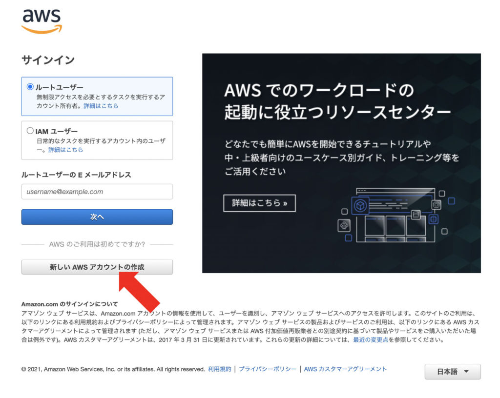 (3)【新しいAWSアカウントの作成】をクリックします。