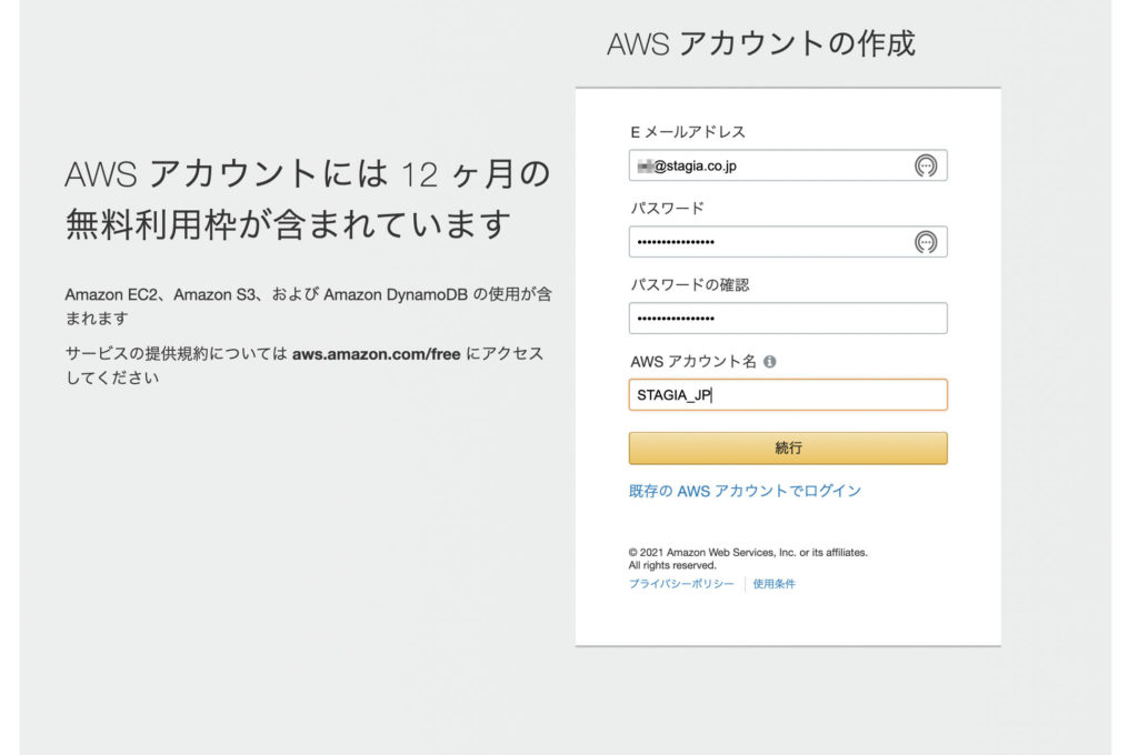 (4)アカウント作成の画面にメールアドレスとパスワード、アカウント名を入力します。