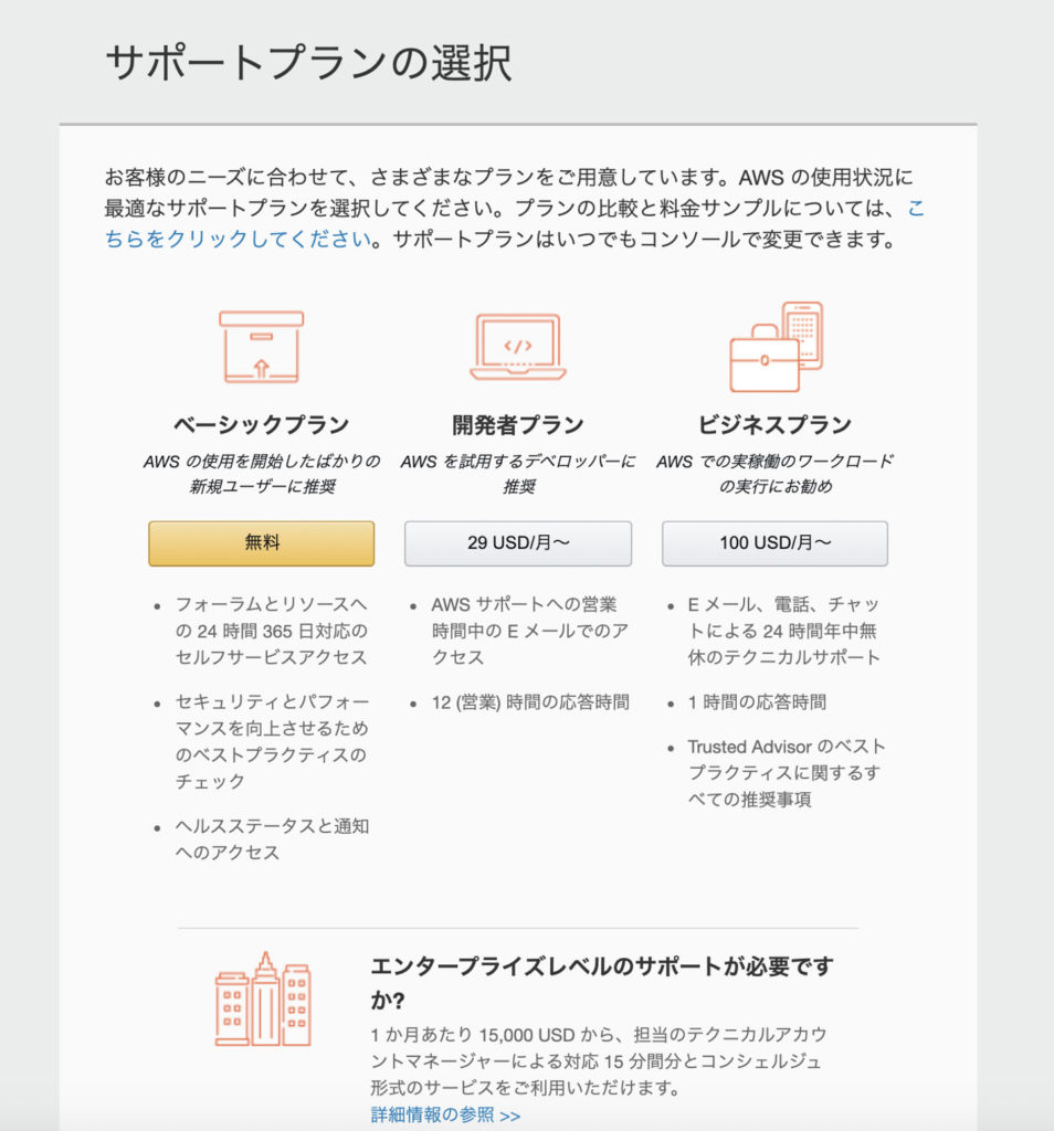 (8)AWSの有償サポートの利用確認画面が表示されます。