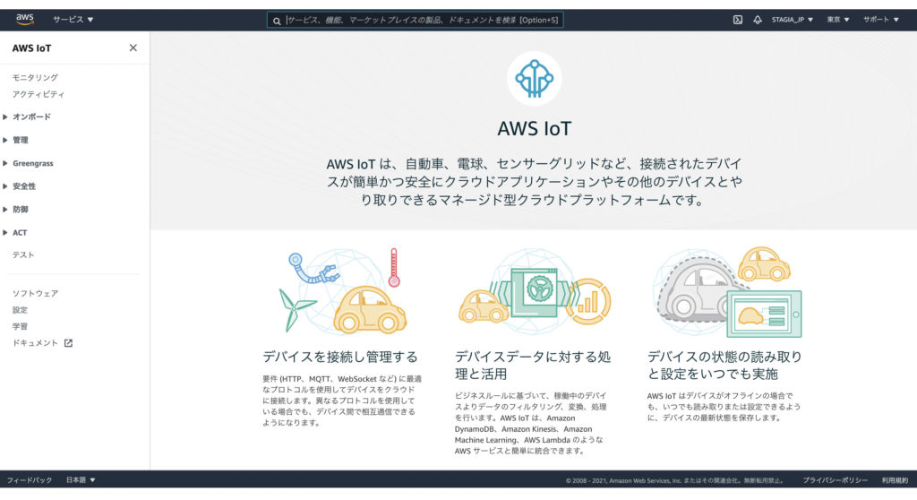 (2)AWSマネジメントコンソールにログインし、AWS IoTのダッシュボードを開きます。