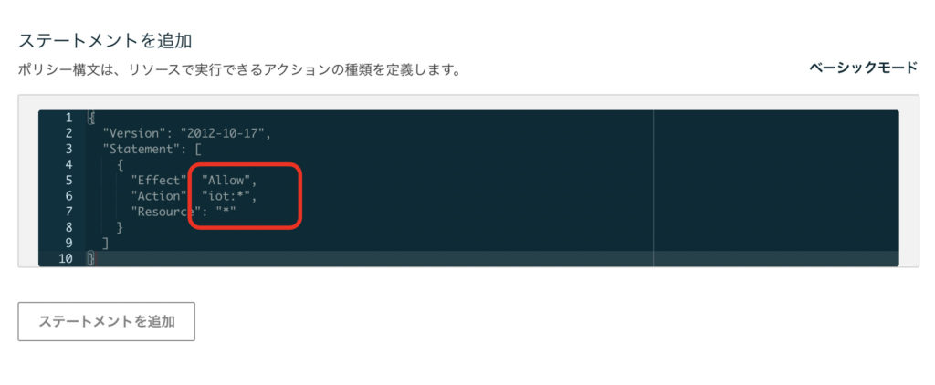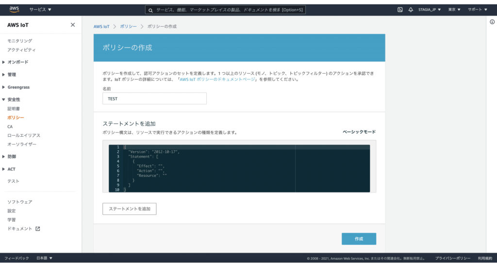 (7)ポリシーを定義します。以下のように入力し、【作成】をクリックします。