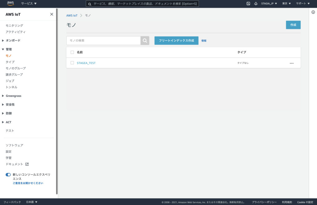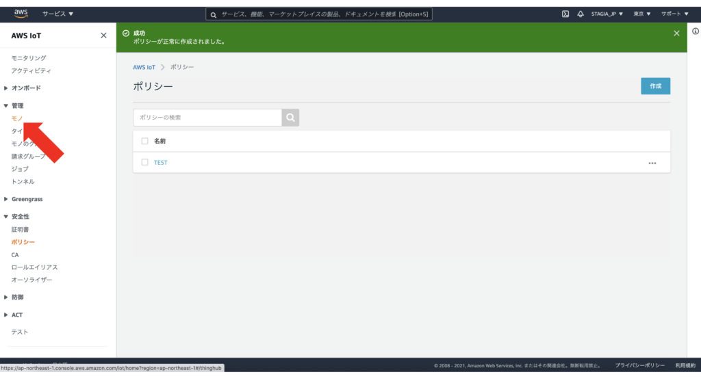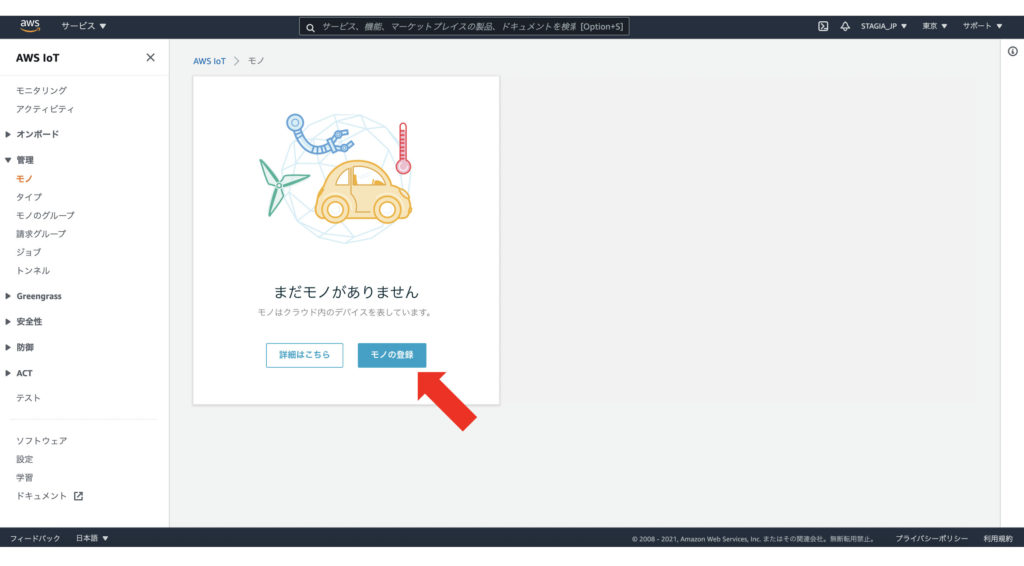 3.AWS IoTの画面が表示されたら、左カラムの[管理]->[モノ]をクリックします。