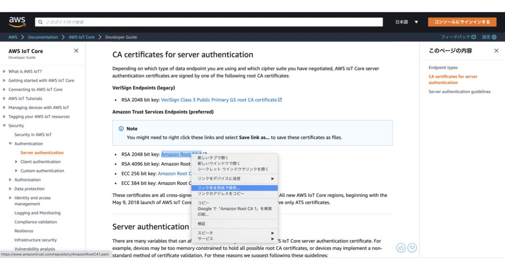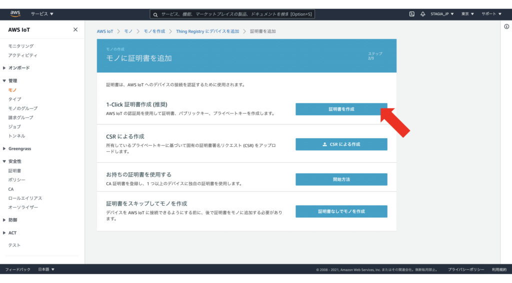 証明書とは、外部のデバイスからAWS IoTにアクセスする際に使用する鍵のようなものです。