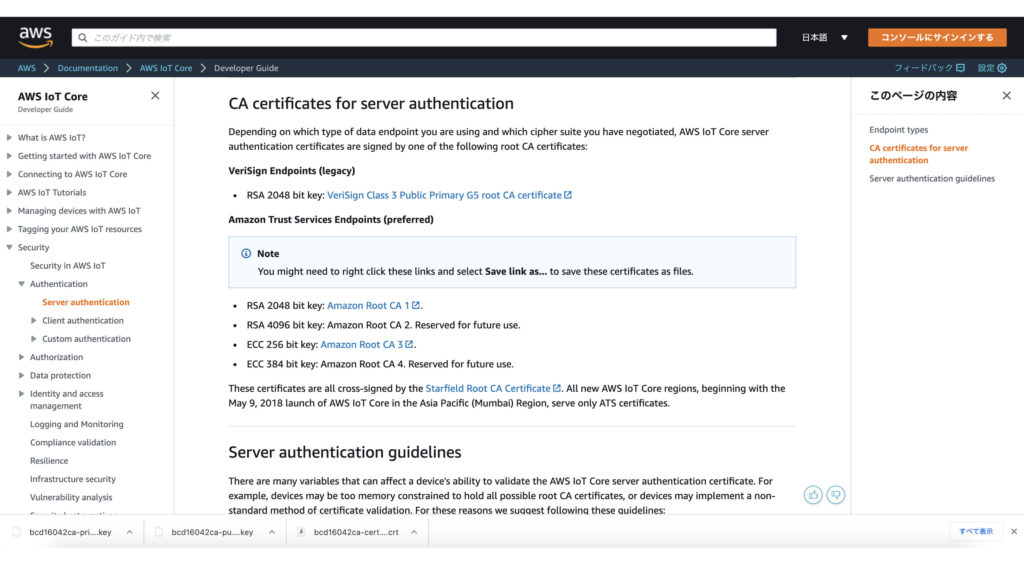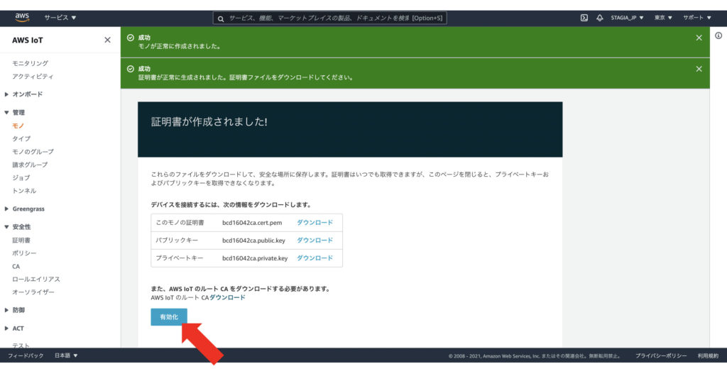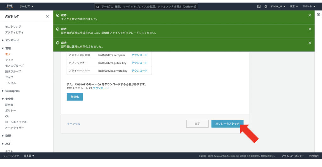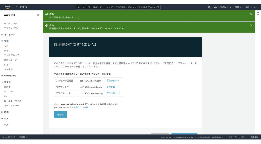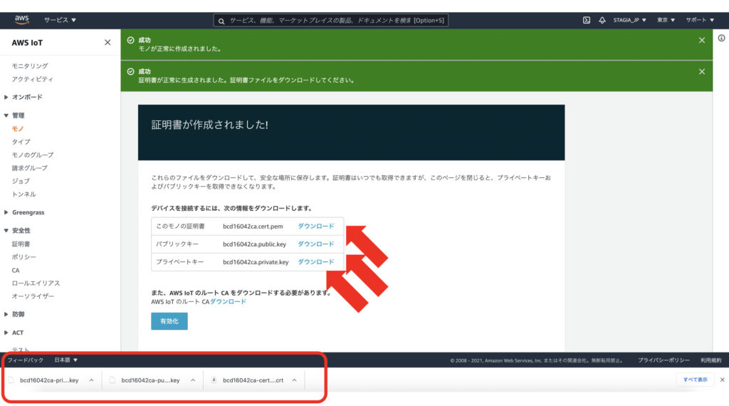 (15)モノの証明書、パブリックキー、プライベートキーの3つが作成されますので、3つともダウンロードします。