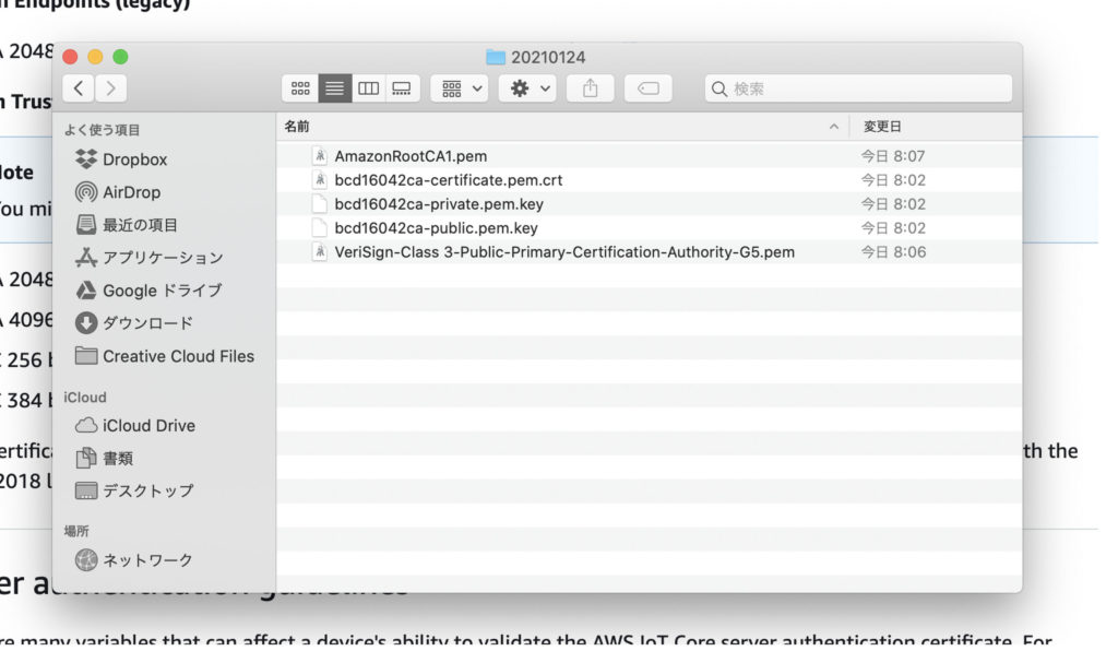 (11)次に、AWS IoTをセットアップする時にダウンロードした証明書やキーをプログラムにインストールします。