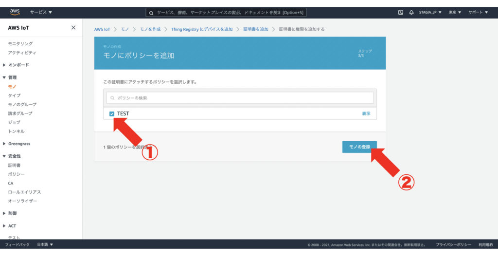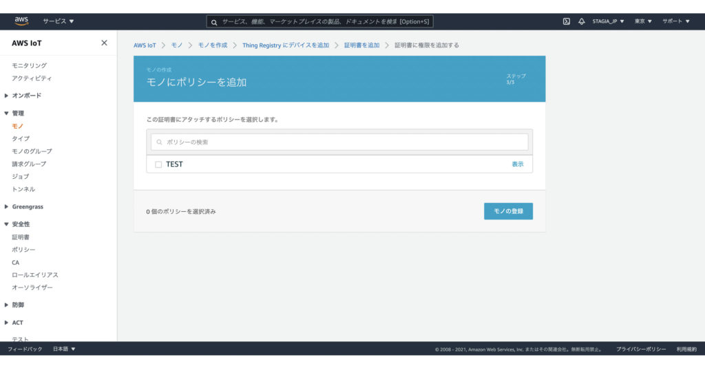 (23)(6)で作成したポリシーの左側のチェックボックスにチェックを入れて、【モノの登録】をクリックします。