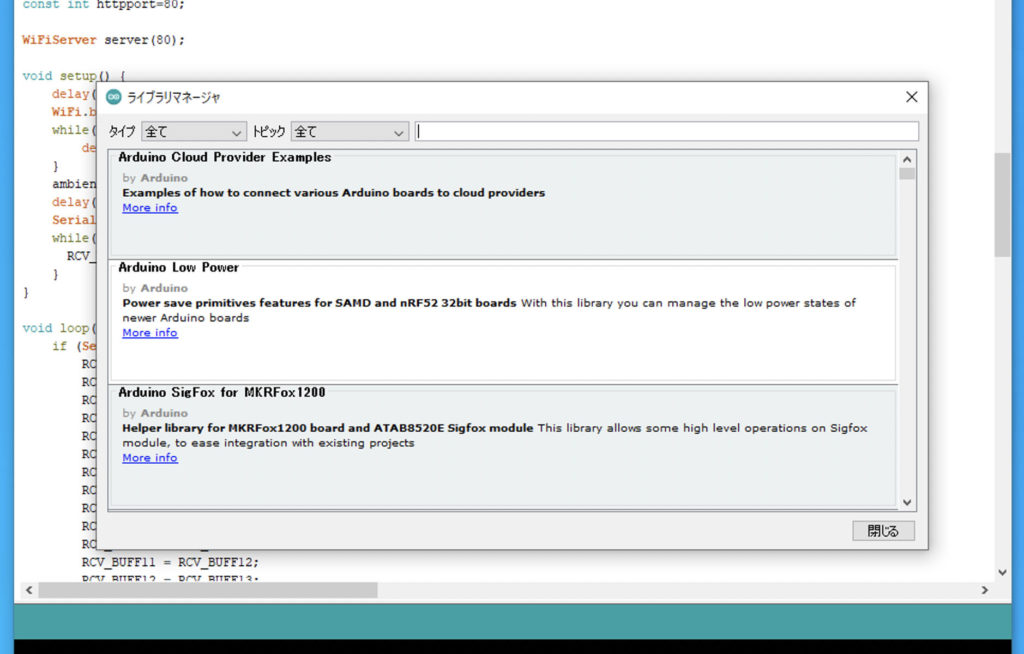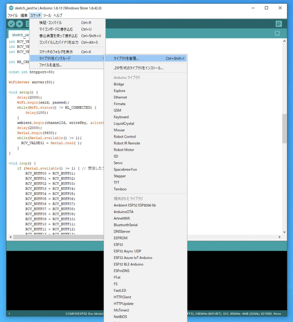 メニューバー[スケッチ]->[ライブラリを管理]をクリックします。