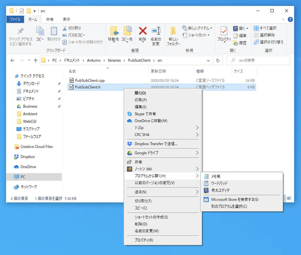 ライブラリをインストールしたフォルダを開いて、PubSubClient.hを開きます。