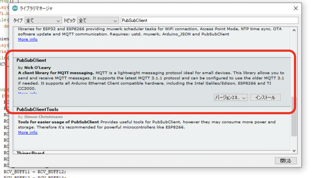 (4)ライブラリマネージャの上部にあるテキストボックスに、PubSubClient と入力します。