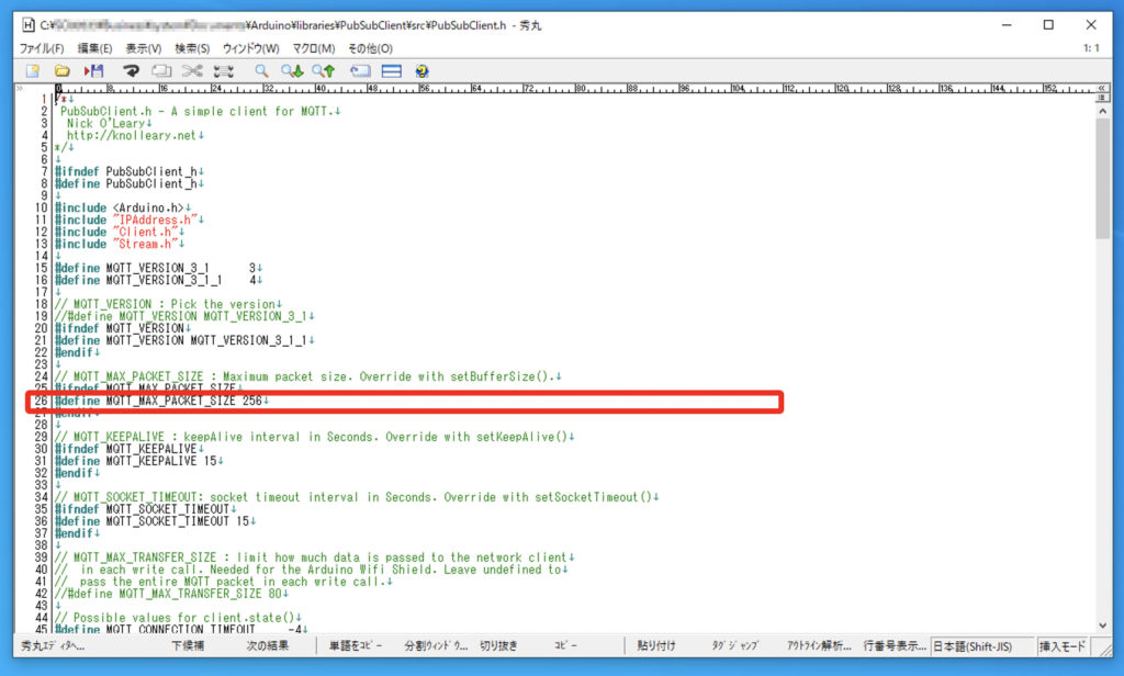 (7)MQTT_MAX_PACKET_SIZE 256 の256の部分を2048に修正します。