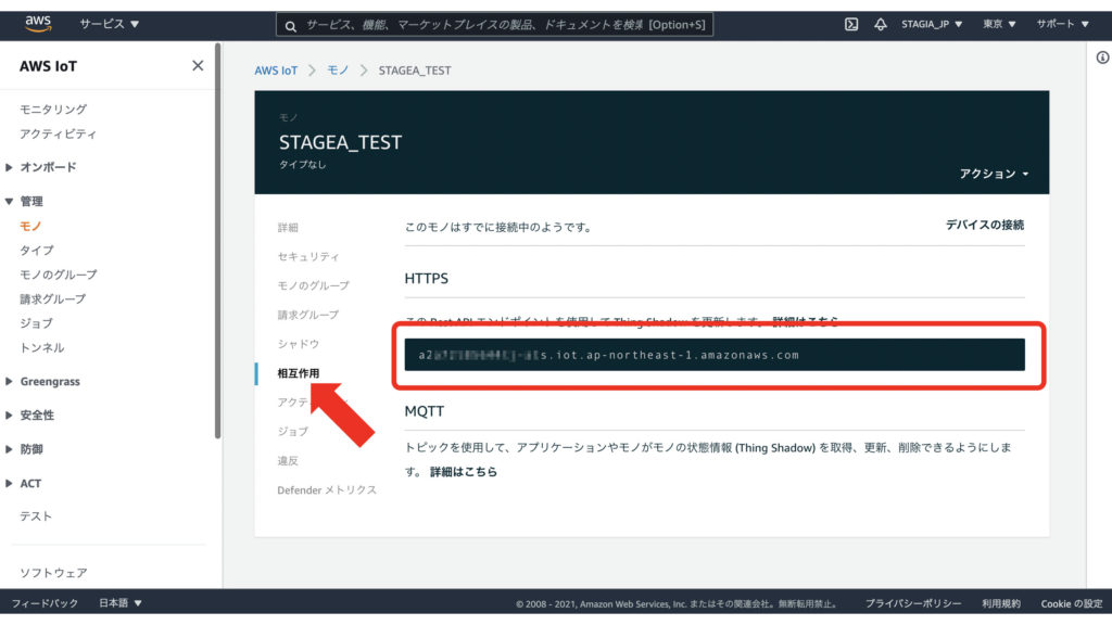 5.予め作成したモノの詳細が表示されます。【相互作用】をクリックするとHTTPSの部分にURLが表示されるので、コピーします。