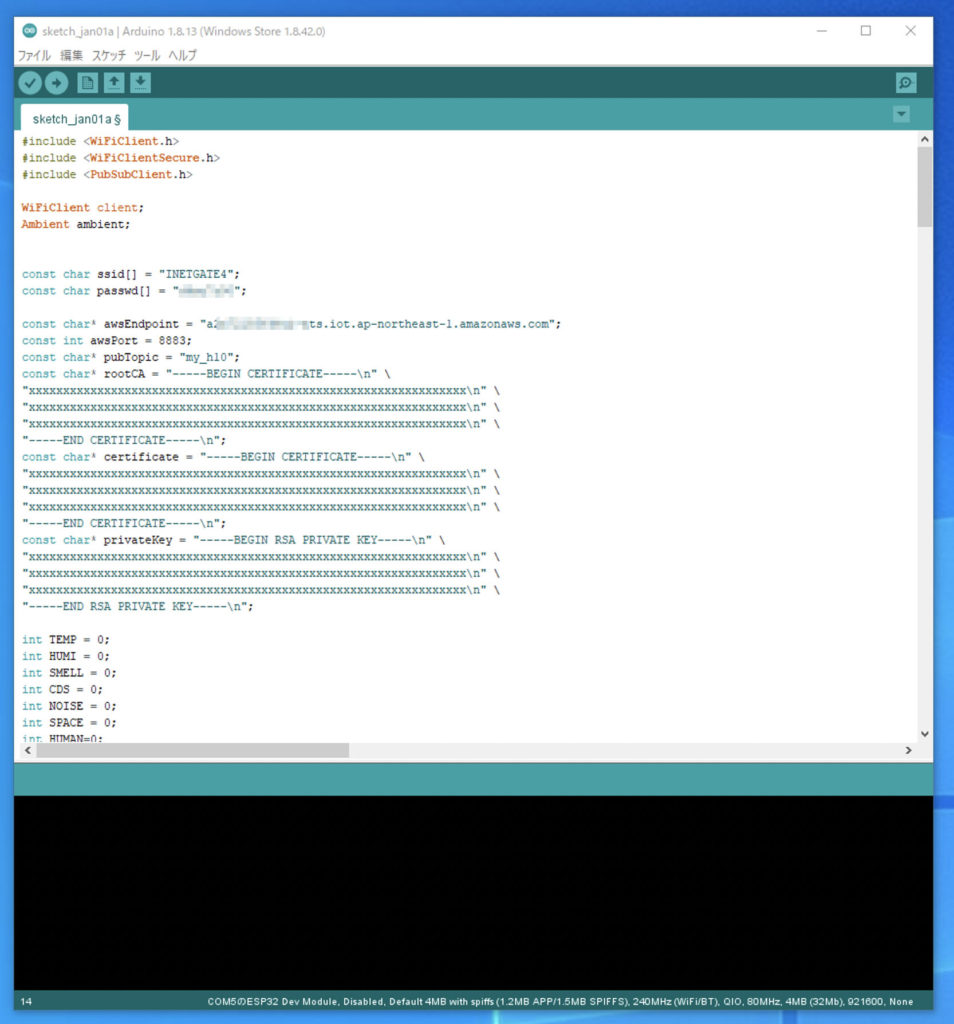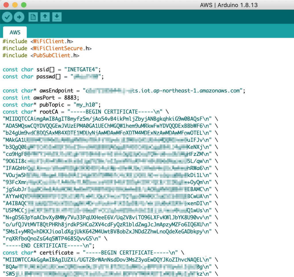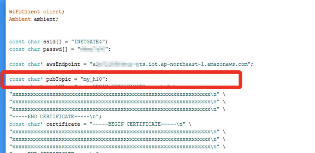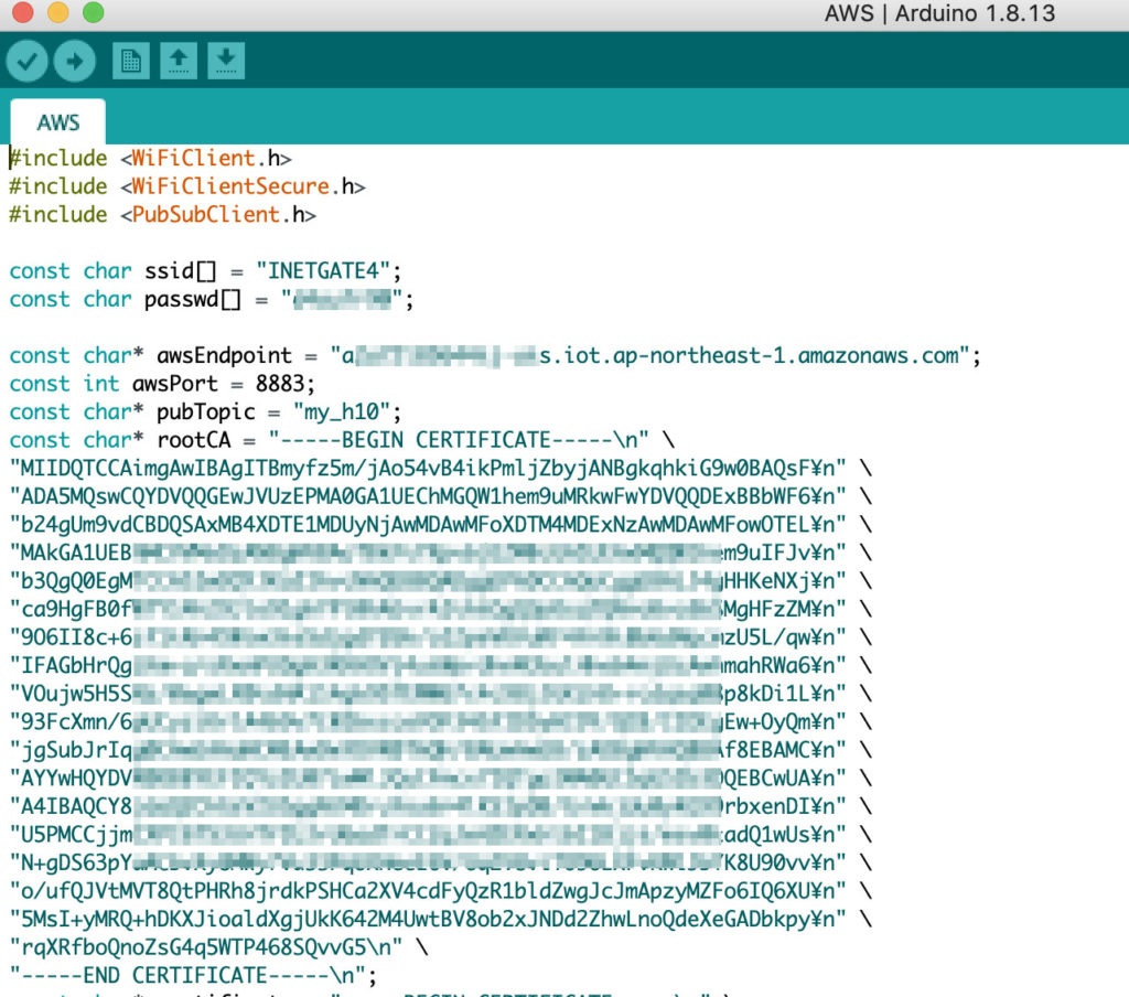 awsEndpointのすぐ上にあるssidとpasswdも同じようにお手持ちのWiFiアクセスポイントと設定をあわせて接続できるようにします。