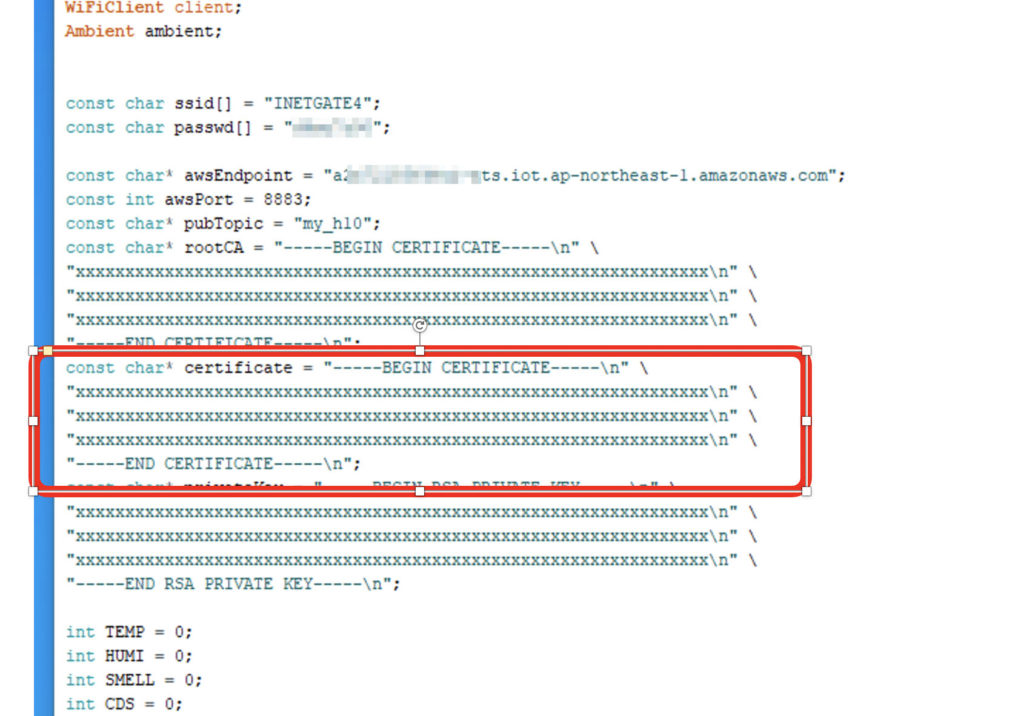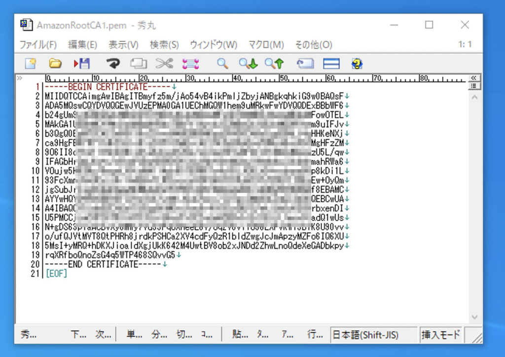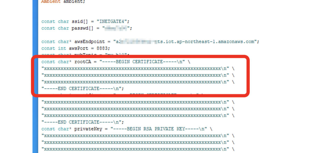 ここに、AWS IoTセットアップの際にダウンロードした AmazonRootCA1.pem をテキストエディタで開いたものをコピーします。