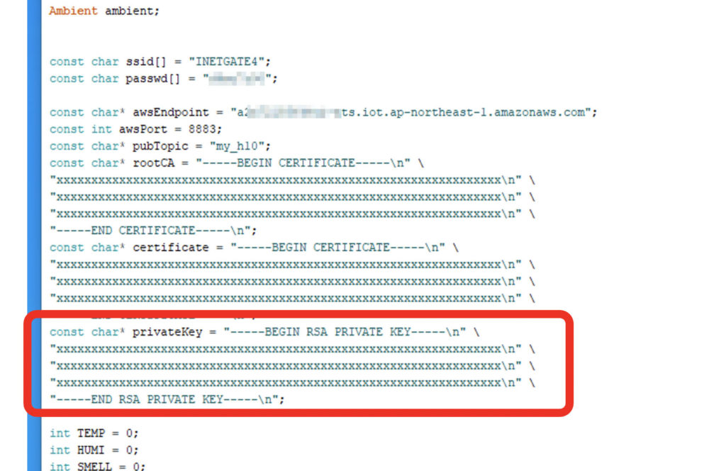 (10)コピーしたURLをArduino画面のプログラムのawsEndpointの部分に貼り付けます。