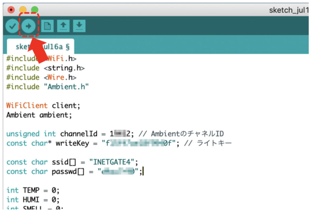 (4)H10のDCジャックからプラグを抜き、数秒待ってから挿し直し、5~10秒程度待ってから、Arduinoの【マイコンボードに書き込む】ボタンをクリックします。