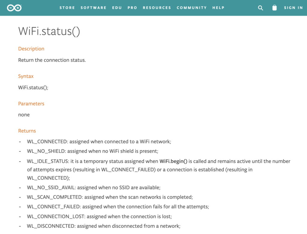 「WiFi.status」でインターネット検索すると、Arduino公式ページのガイドに辿り着くことができます。