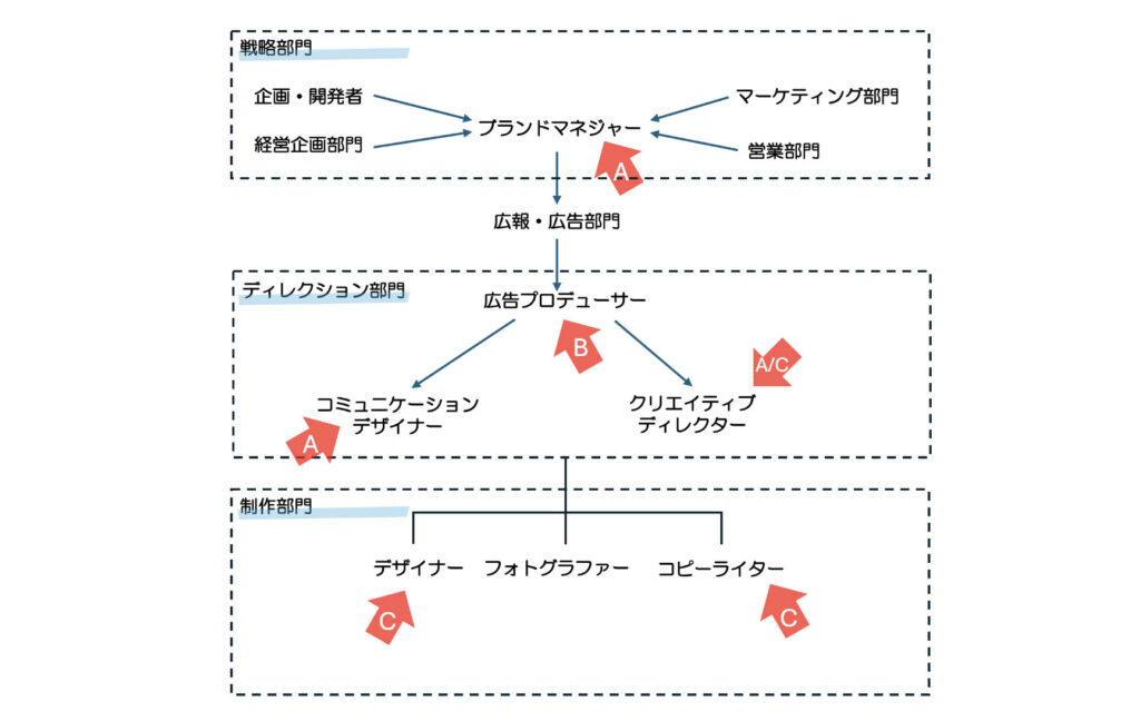 ここでは、コミュニケーション・コンセプトに基づいて、生活者にとっての接点として機能するクリエイティブワークに進んでいくことになります。